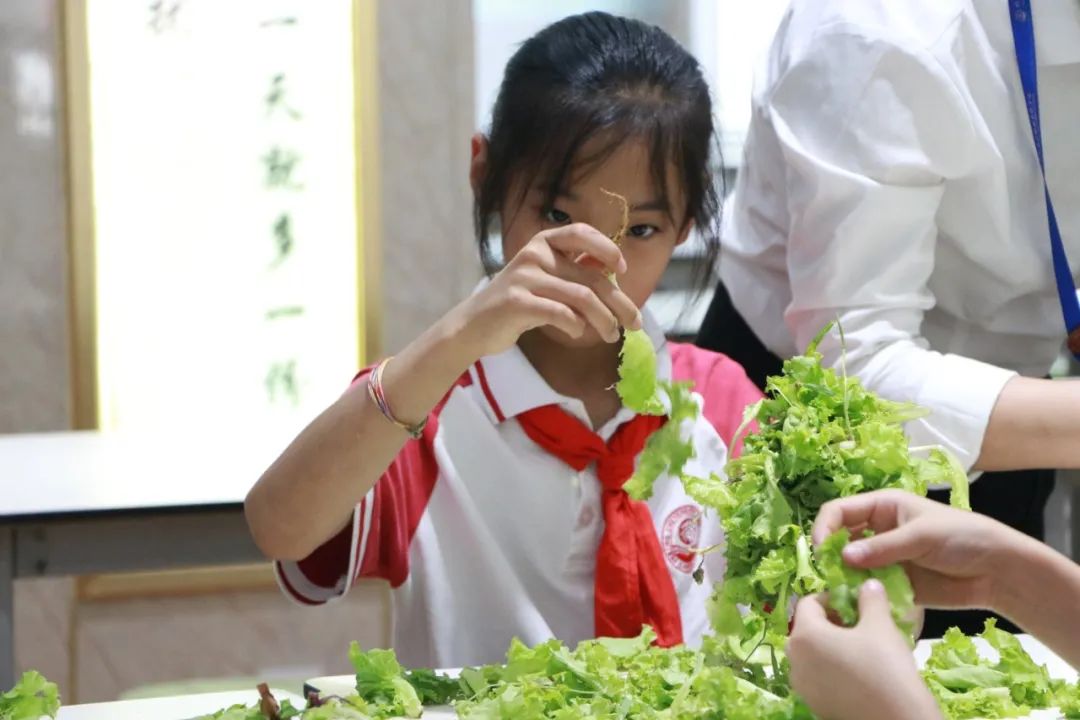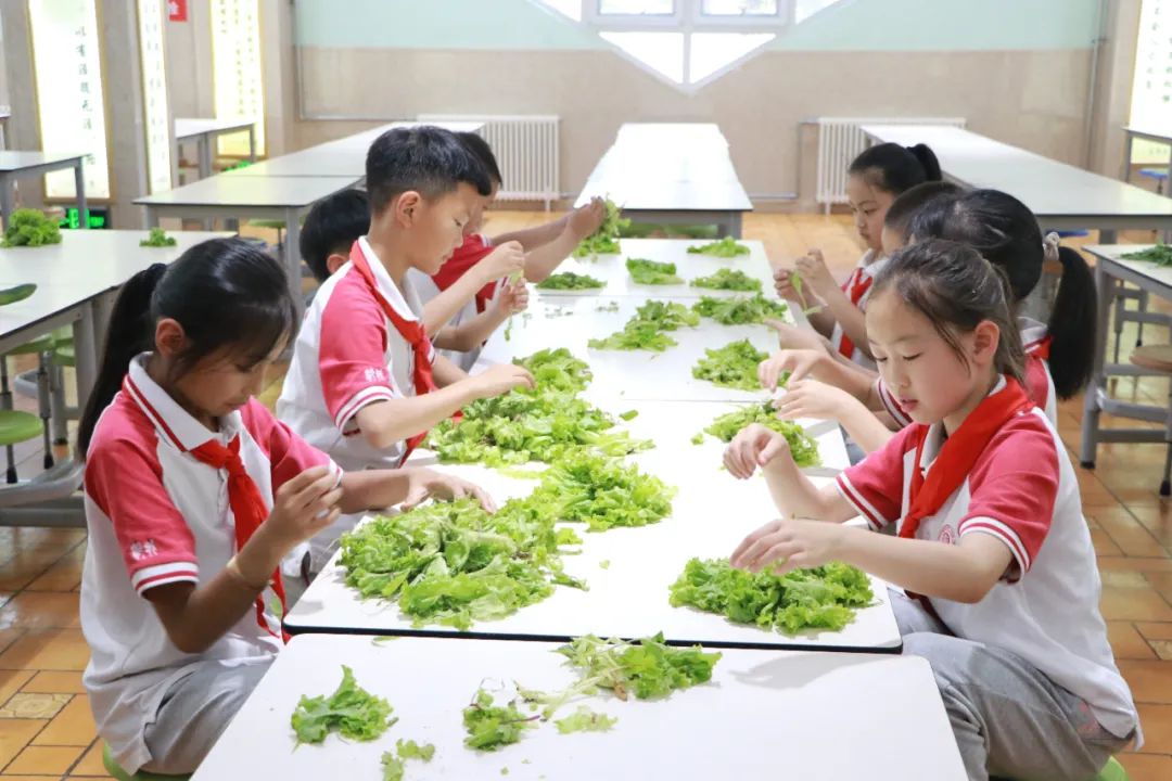 带着采摘的蔬菜,孩子们来到了学校食堂,开启了择菜和洗菜的奇妙之旅。食堂的叔叔阿姨耐心地为孩子们示范择菜的方法,教他们如何去除蔬菜的黄叶和根部。孩子们学得有模有样,他们分成小组,相互协作,不一会儿,就把一堆蔬菜择得整整齐齐。