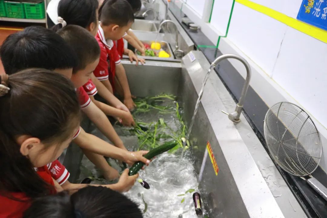 孩子们把蔬菜放进水池,打开水龙头,清澈的水流冲洗着蔬菜,他们用小手仔细地揉搓着每一片叶子,不放过任何一个角落。经过多次清洗,蔬菜变得干干净净,在阳光下闪烁着诱人的光泽。
