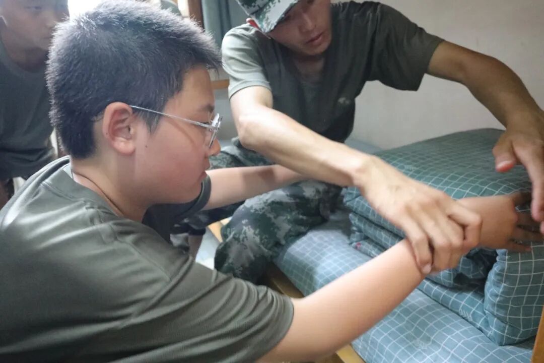 同学们紧跟节奏,反复练习叠被、归置物品、清扫宿舍,从生疏到熟练,每一步都透着认真。