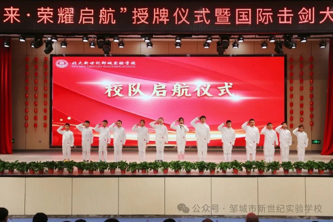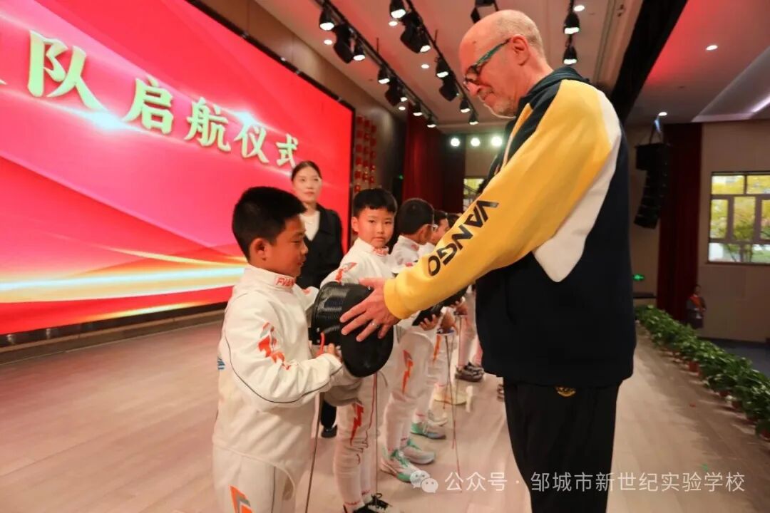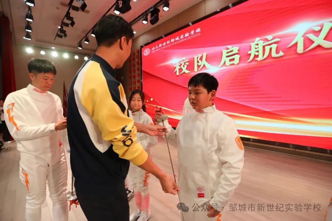 随后,万国教练将象征专业与传承的击剑队队旗授予校队,旗帜挥舞间,责任与力量层层传递。