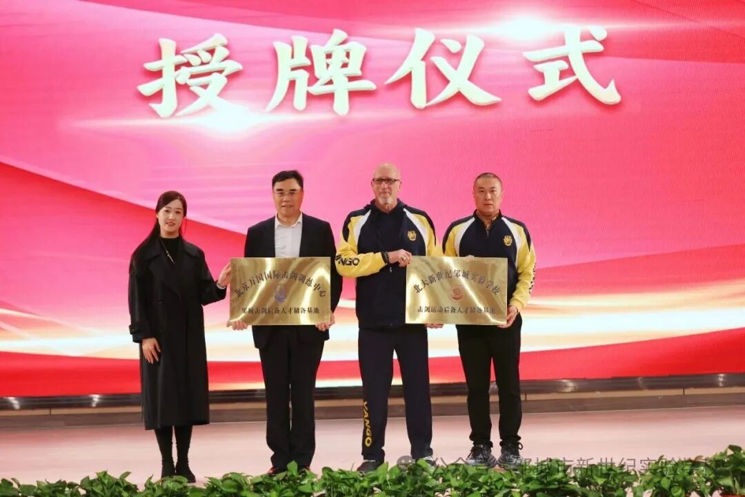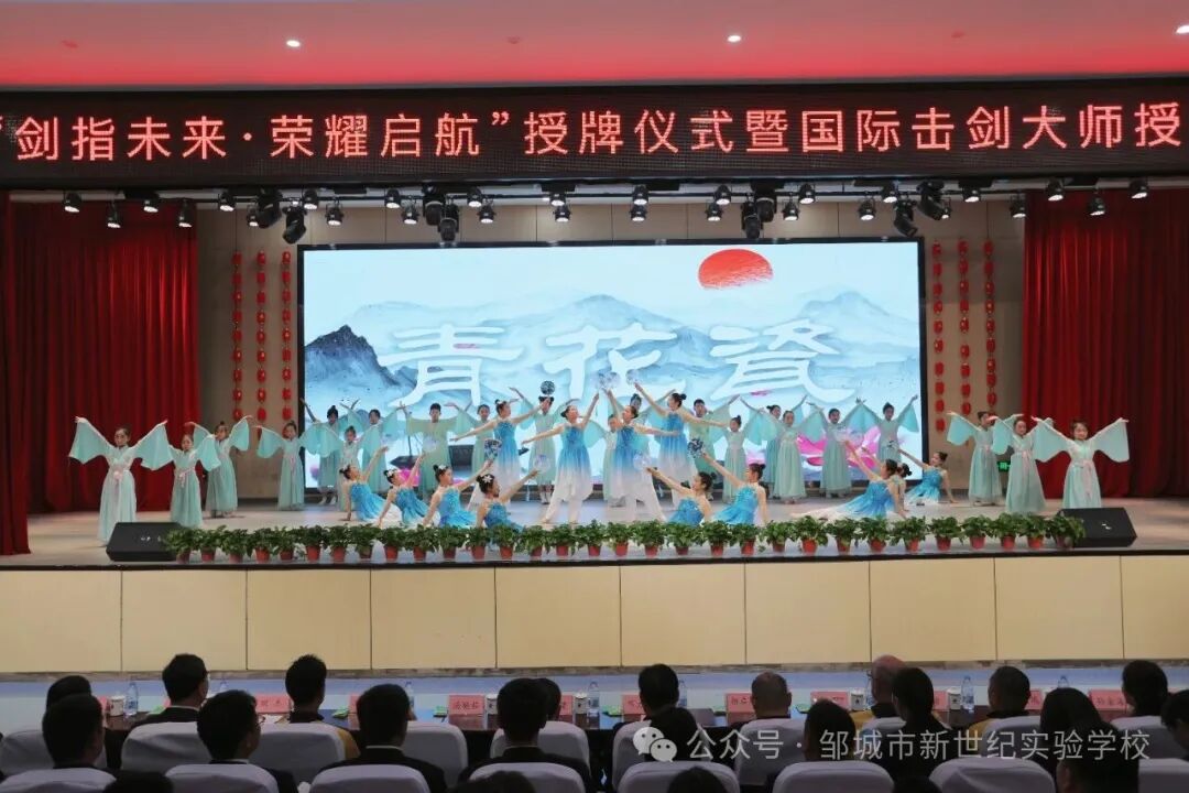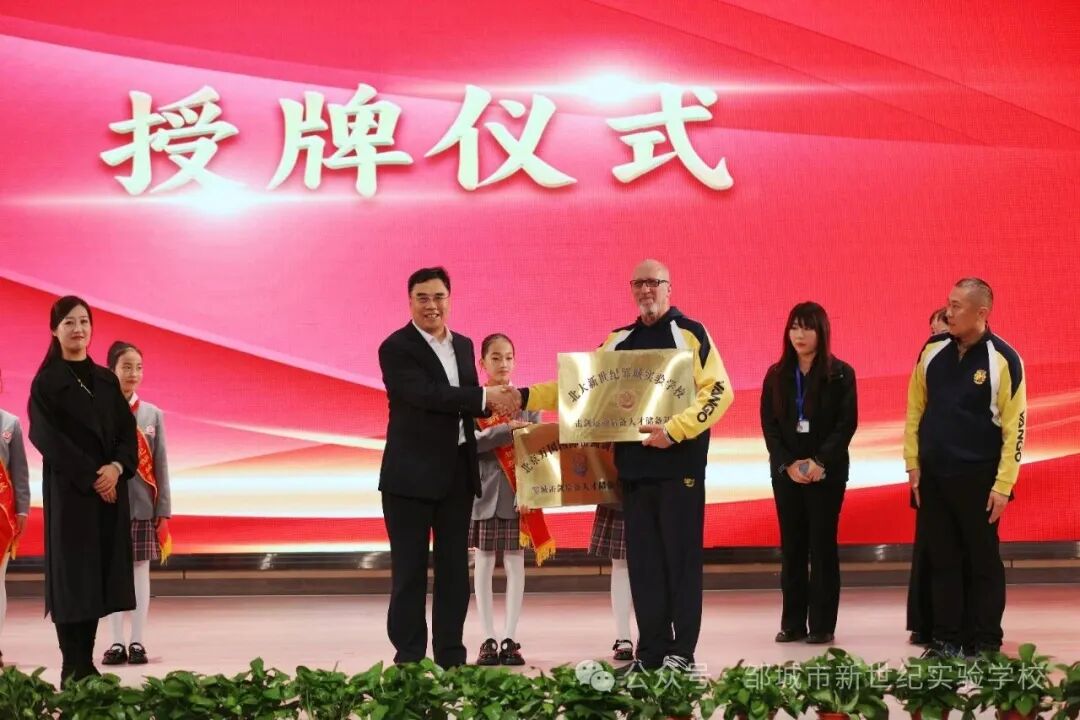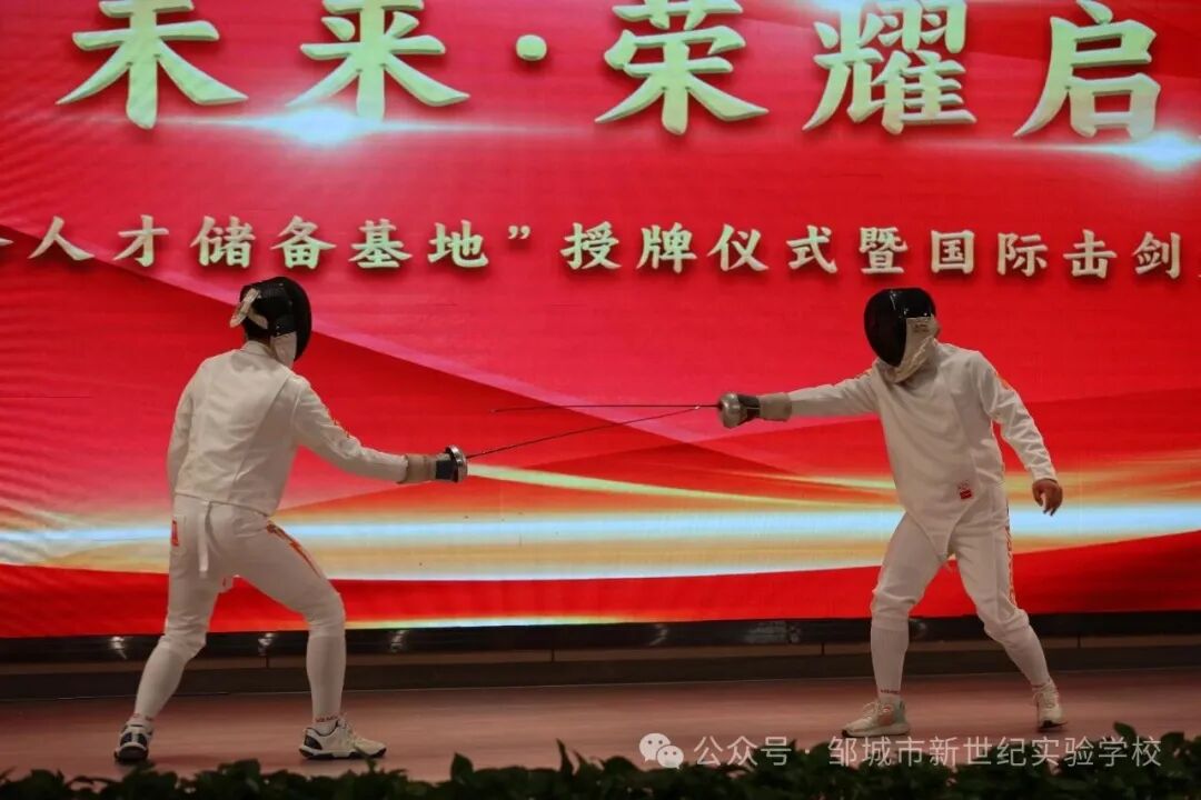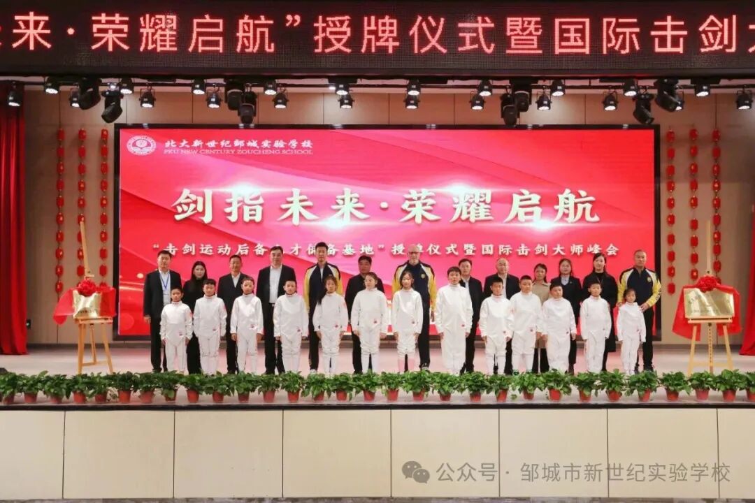 现场举行隆重的双向授牌仪式,我校向万国击剑授予“战略合作伙伴”牌匾,万国击剑总部授予我校“邹城击剑后备人才储备基地”牌匾。